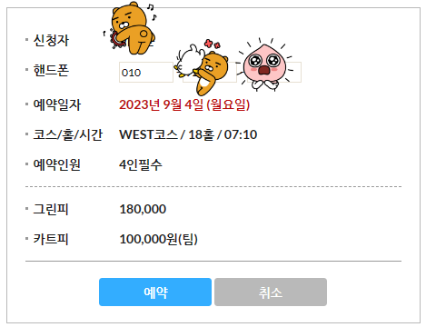 | 부킹 어플 (앱 App) | 카카오골프예약, 골프존, 골프몬, 그린라이트 | 휴대폰 |