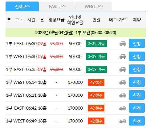 5. 예약 가능한 코스와 시간 리스트가 나오고 원하는 티업이 있다면 우측 신청버튼을 누른다.